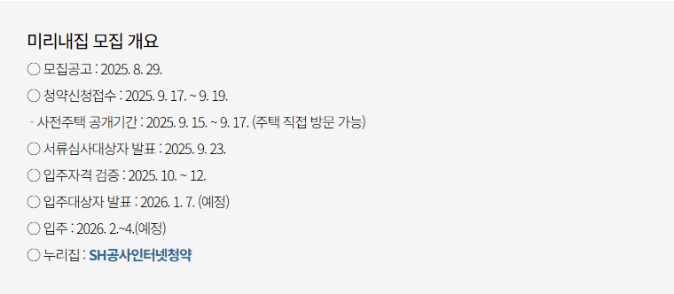- 사전 주택 공개 기간: 2025년 9월 15일 ~ 9월 17일 (직접 방문하여 주택 상태 확인 가능)